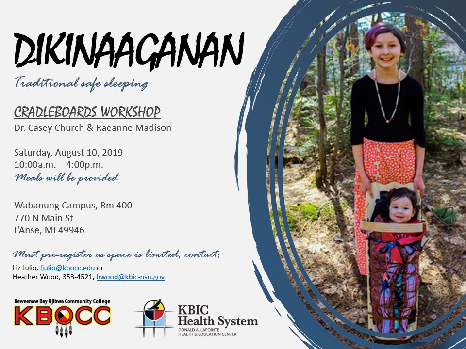 Dikinaaganan: Traditional Safe Sleeping, Cradleboards Workshop with Dr. Casey Church & Raeanne Madison. Saturday August 10, 2019. 10:00am-4:00pm