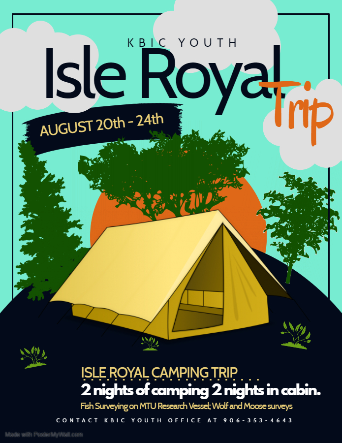 KBIC YOUTH: Isle Royal Trip, August 20th - 24th 2 nights of camping, 2 nights in cabin.