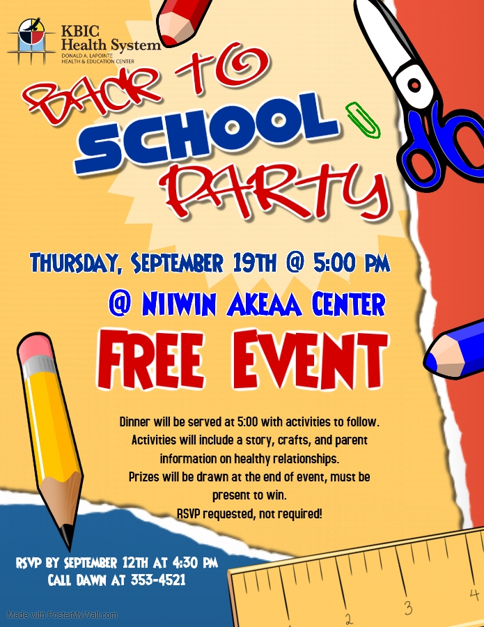 Back to School Party, Thursday, September 19th @ 5:00 PM @ Niiwin Akeaa Center - FREE EVENT