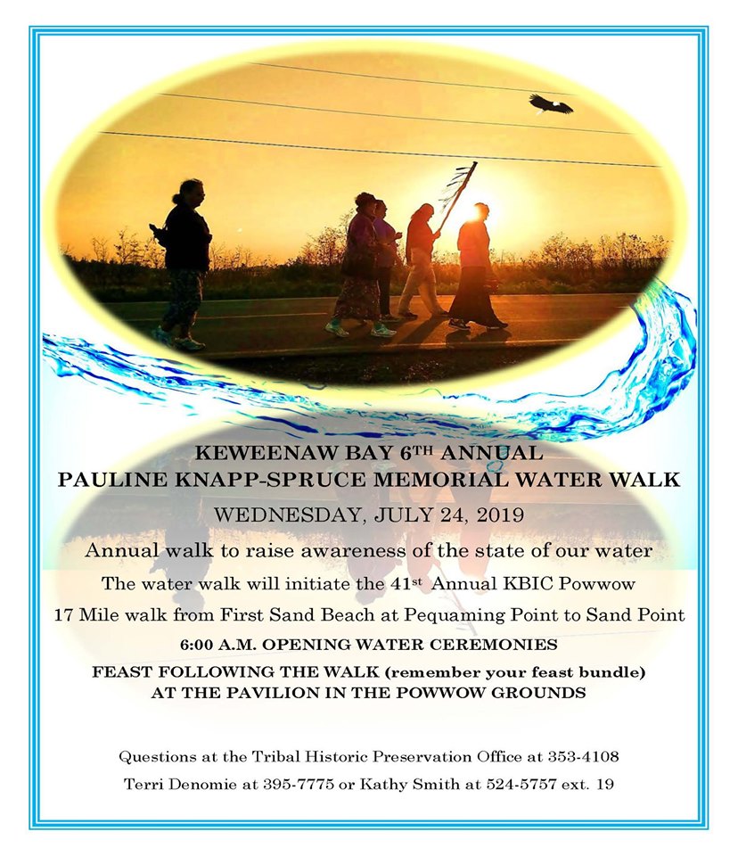 Annual walk to raise awarness of the state of our water, the water walk will initiate the 41st Annual KBIC Powwow.