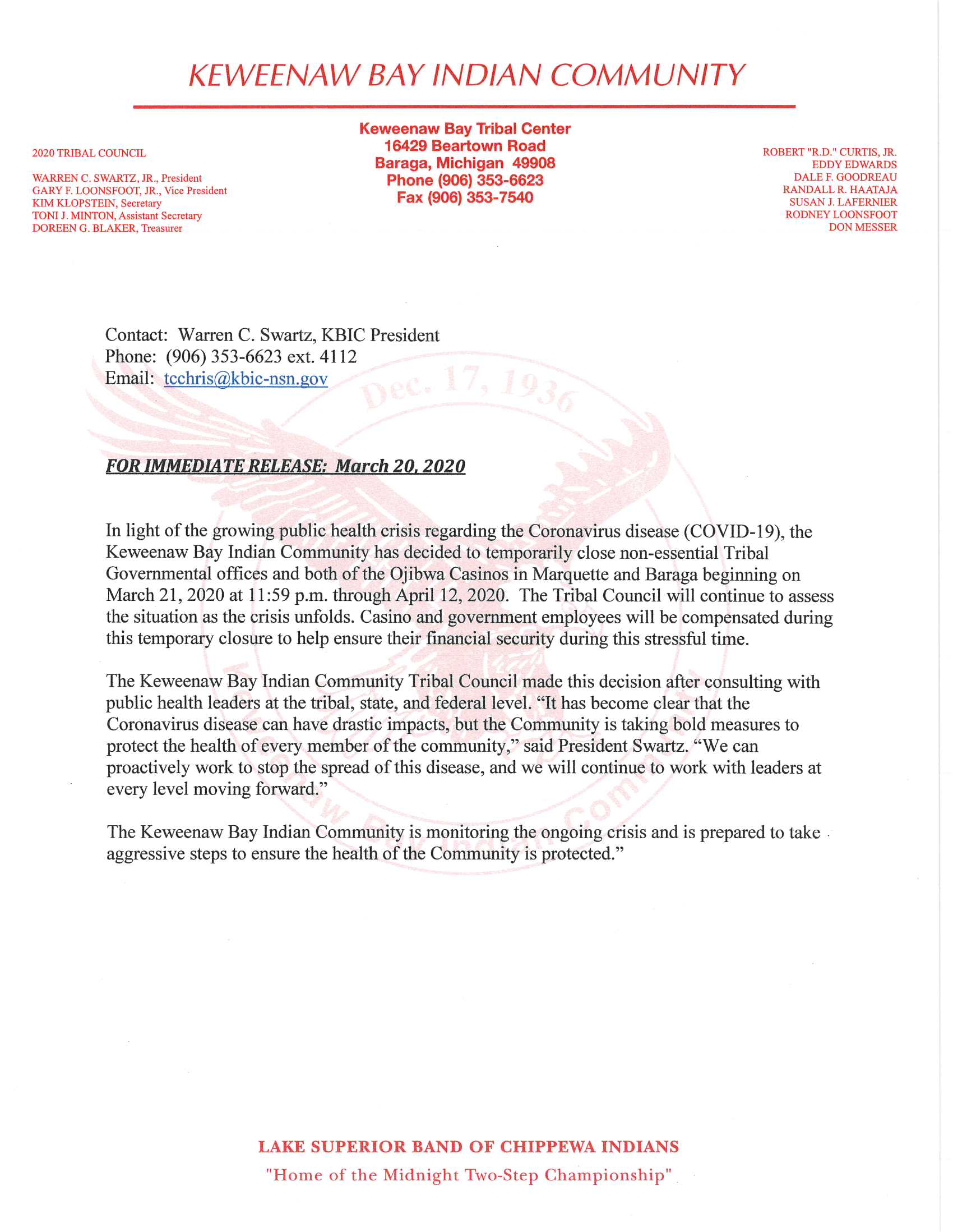 Press Release - March 20, 2020 Government and Casino Closure