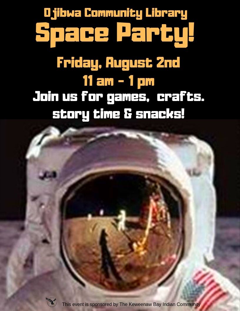 Ojibwa Community Libray Space Party! Friday, August 2nd 11am - 1pm. Join us for games, crafts, storytime, and snacks!